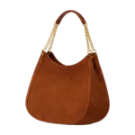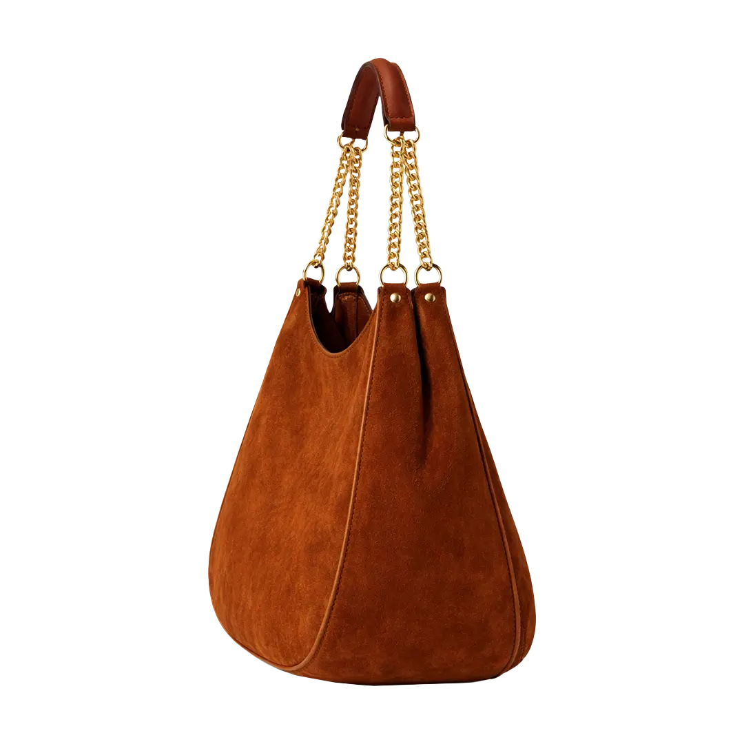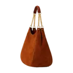 Una silueta de inspiración orgánica y tacto sedoso. Este diseño fusiona la calidez de la gamuza italiana con la distinción de una cadena metálica joya, creando una pieza de elegancia relajada y movimiento natural.